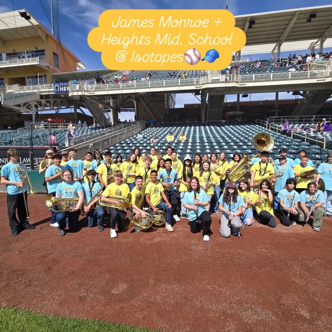 The Collaborative National Anthem Performance initiative brings together the symphonic band students from Heights Middle School and James Monroe Middle School to perform at an Albuquerque Isotopes “School Day Matinee” game. Students rehearse separately, then unite for a joint performance, fostering musical collaboration, peer connection, and civic duty for the community. The event also allows time for social interaction and group integration between the students. Launched in Spring 2025, our first performance marked the beginning of what is now planned to become an annual tradition celebrating music education, teamwork, patriotism, community service, and collaboration between the two schools.