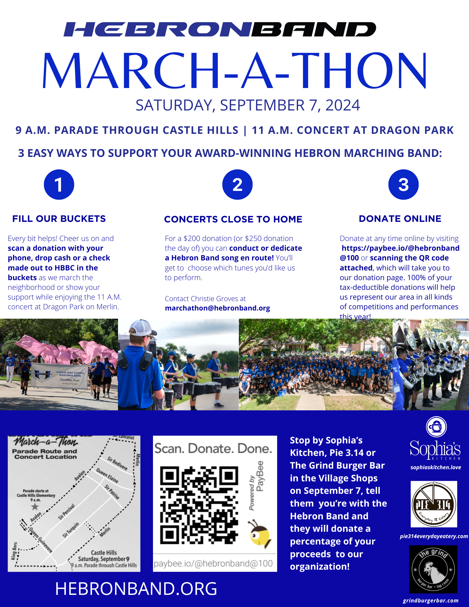 The Hebron Band March-a-thon is a large-scale initiative made possible by the coordination and generosity of over 70 parent and community volunteers, as well as dedicated booster club leadership and band directors.