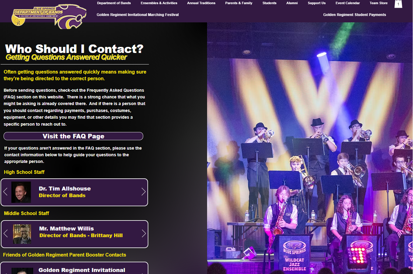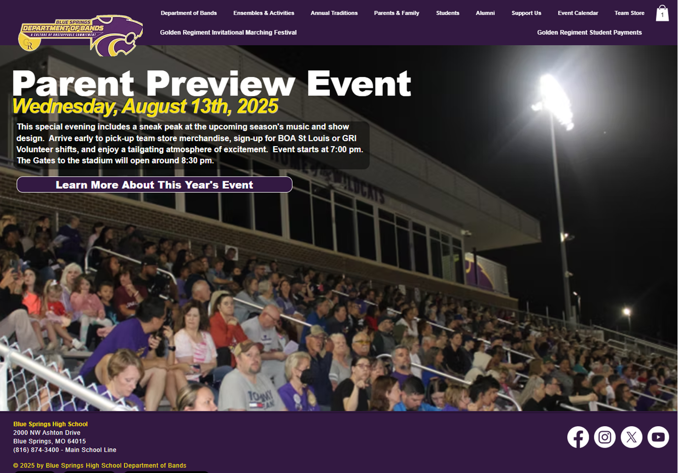 In 2025, the Blue Springs Department of Bands created a new website to encompass all the activities of the program. The previous site focused solely on the activities of the marching band. It was created using an address that had no search viability, and only parents needing to access the site to submit payments knew where to go. The previous site hadn’t been updated for over three years with old images of past shows. The booster program has evolved to also manage the activities of concert bands, jazz bands, color guard, and percussion ensembles.